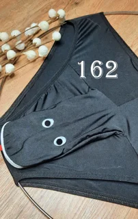 اندازهها: مدیوم-لارج: عرض کمر ۲۸ با کشسانی ۱۰، فاق ۲۱ با کشسانی ۴ سانتیمتر؛ سایز بزرگتر ۲–۳ سانتیمتر اضافه با کشسانی مشابه